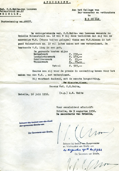 Afschrift van Wed. C.H. Smits aan gemeente Brielle over het laten maken van een watercloset.