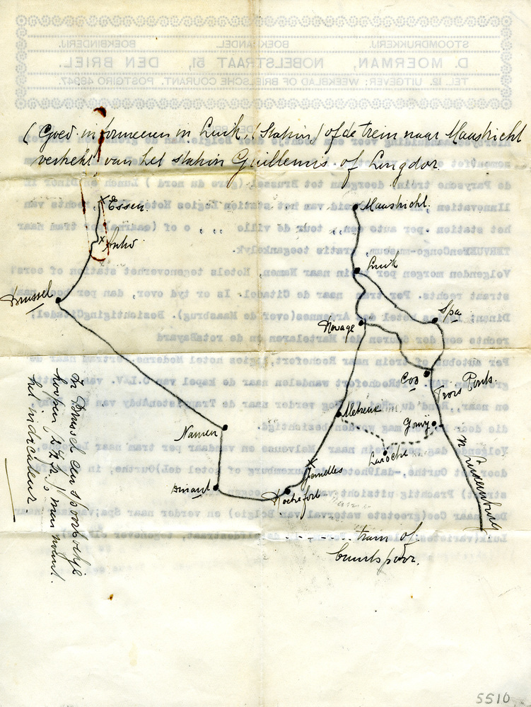 Aankondiging per brief voor tocht door België door D. Moerman. Rondreis bestaande uit meerdere dagen en verschillende plaatsen in België. Op achterkant is een kaart getekend met de route van de rondreis.