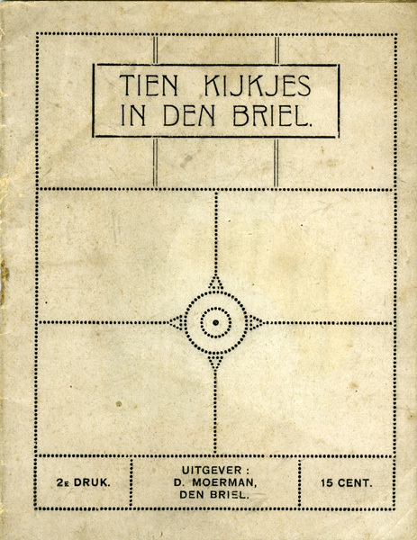 Klein boekje in de vorm van een gids getiteld: 'Tien kijkjes in Den Briel' uitgegeven door D. Moerman . In de gids zitten afbeeldingen van belangrijke plaatsen uit Brielle met daaronder de titel waaronder: Sint Catharijnekerk, interieur Sint Catharijekerk, het Merula Weeshuis, Wellerondom, Plantage, Buitenhaven, Aanlegplaats voor schepen op Maarland, stadhuis, Graftombe van Philips van ...