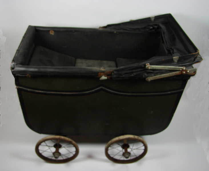 Kinderwagen, groen met een zwart/witte bies. Binnenkant is voorzien van zwart kunststof. Kinderwagen voozien van witte wielen. Brielse kunstenaar Piet Middelhoek (1930-2004) heeft in deze kinderwagen gelegen. Binnenkant van kap is voorzien van een rand textiel met meandermotief. Handvat ontbreekt.