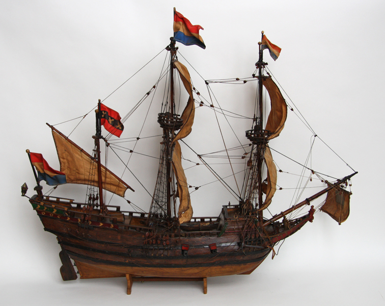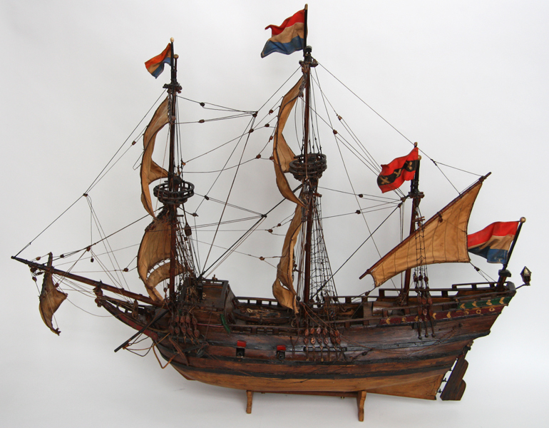 Scheepsmodel VOC schip 'de Halve Maen'. Een volgetuigde driemaster (Hollands jacht) met een smal achterdek. Op de spiegel staat een gekleurde afbeelding van een halve maan. Het model heeft drie Hollandse vlaggen en 1 Amsterdamse vlag. Op het middendek staat een reddingsloepje. Het model heeft twee kraaiennesten en een lantaarn aan de achterzijde. Aan weerszijden ...
