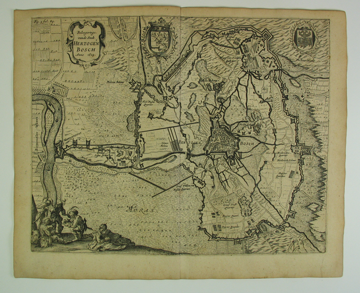 Prent, kopergravure met Beleg van ’s-Hertogenbosch, 30 april-14 september 1629 door Frederik Hendrik. Cartografische voorstelling met centraal de stad, het omliggende land en de kwartieren van de belegeraars. Linksboven een cartouche met daarin de titel, middenboven gekroond wapenschild van Frederik Hendrik, rechtsboven een wapenschild van de stad 's-Hertogenbosch, rechtsonder afbeelding van vijf personen. Kopgergravure uit ...