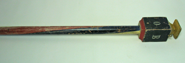 Stok, brandweerstok, werd oorspronkelijk door de brandweer gebruikt om het publiek bij een brand op een afstand te houden. Stok beschilderd in drie gedraaide kleuren rood, wit, blauw. Onderkant van stok is blauw/zwart. Bovenkant stok is voorzien van vierkantige blauw/zwarte bekroning. Op een zijde van de bekroning een wapen, op andere zijden letters; A, B ...