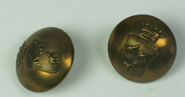 Set van twee koperen knopen met daarop een afbeelding van het wapen van familie Roest van Limburg. Op onderkant knoop inscriptie: 'DOELLING (: S. WUNDER. / CARLSRUHE'.
