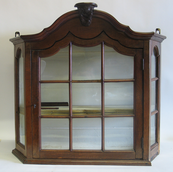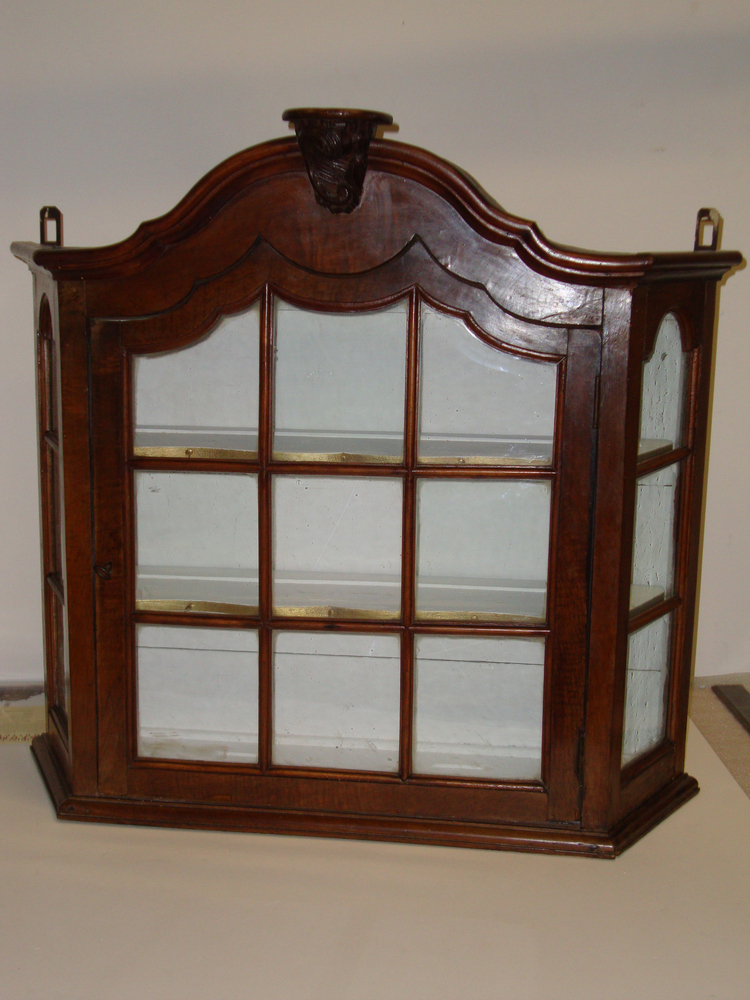 Houten kastje of vitrinekastje voor aan de wand, bovenkant accoladevormig, met twee losse plankjes. achterwand kastje wit. Voorzien van twee ophanghaken. Met sleutel.