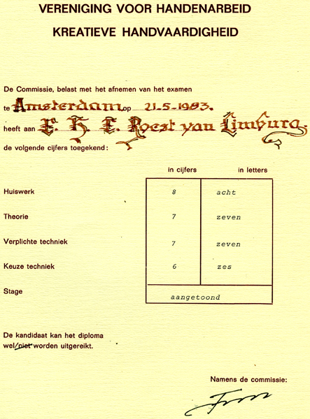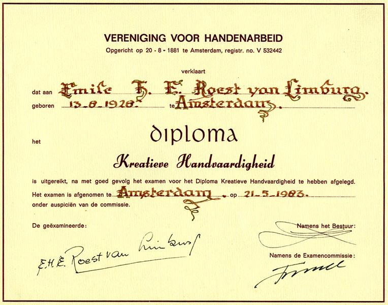 Set getuigschriften, 3 stuks, van Emilie Helene Elisabeth (Elisabeth) Roest van Limburg (1928- ). Eén diploma voor maatschappelijk werk behaald in 1951 en een diploma voor kreatieve handvaardigheid behaald in 1983 met bijbehorend cijferlijst.