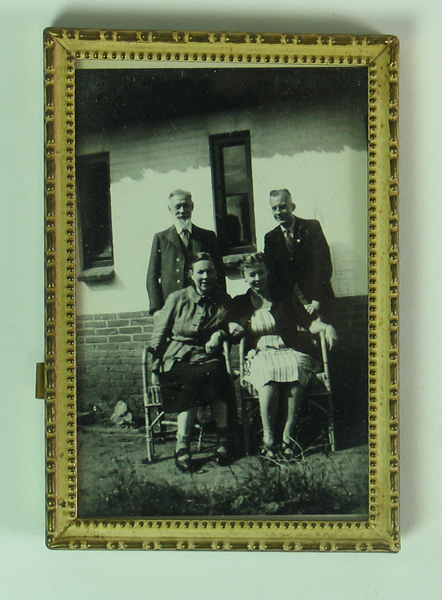 Foto, zwart/wit zijnde een groepsportret van leden van familie Roest van Limburg. Op de voorgrond zitten twee vrouwen op een stoel met daarachter twee heren. Foto in een goudkleurige lijst, aan de binnenkant voorzien van een parelrand.