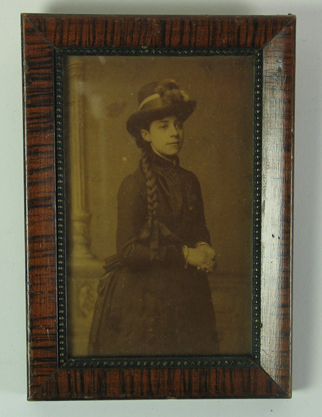 Foto, zwart/wit met portet van Maria Elisabeth Wentholt (1871-1917) als jonge vrouw. Foto in smalle, houten lijstje. Op achterkant een etiket met beschrijving van foto.