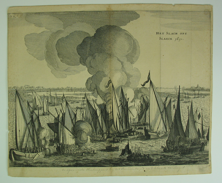 Prent, kopergravure met voorstelling van de Slag op het Slaak op 12 september 1631 tussen de Staatste vloot en de Spaanse vloot.. Voorstelling van diverse schepen in gevecht op het Slaak. Rechtsboven opschrift met titel van de prent. Onder voorstelling een opschrift met potlood geschreven. Linksboven een onleesbaar opschrift. Kopergravure uit : 'Histoire de la ...