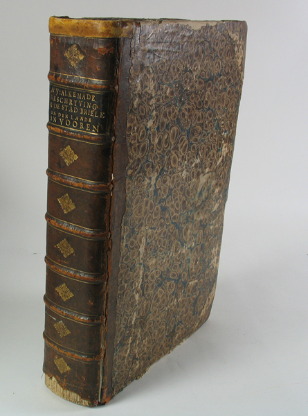 Boek, getiteld: 'Beschryving van de stad Briele en den lande van Vooren (Beschrijving van de stad Brielle en de landen van Voorne)'. Dik boek met bruin/blauw gemarmerde kaft. Brede rug, met bovenin de titel en verder voorzien van goudkleurige florale motieven tussen de katernen. Hoeken zijn verstevigd. In het boek zitten diverse kaarten (cartografisch document) ...