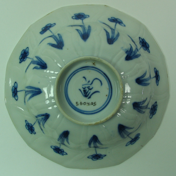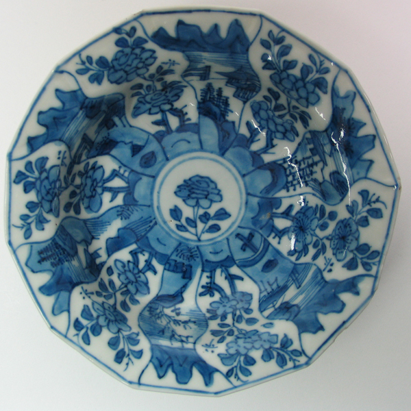 Schoteltje, blauw/wit porselein, met Oosters tafereel waaronder landschap en florlale motieven. Onderkant beschilderd met bloemen en voorzien van een merk.