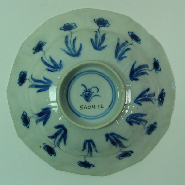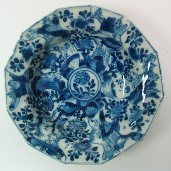 Schoteltje, blauw/wit porselein, met Oosters tafereel waaronder landschap en florlale motieven. Onderkant beschilderd met bloemen en voorzien van een merk.
