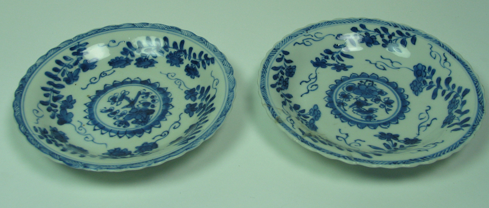 Set schotels (twee stuks), blauw/wit porselein, voorzien van florale motieven en een geschulpte bovenrand voorzien van arceringen. Onderkant beschilderd met bloemen en voorzien van een merk.
