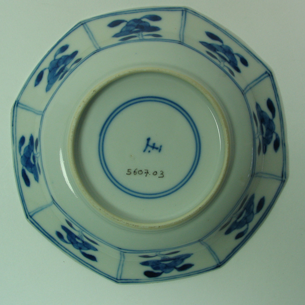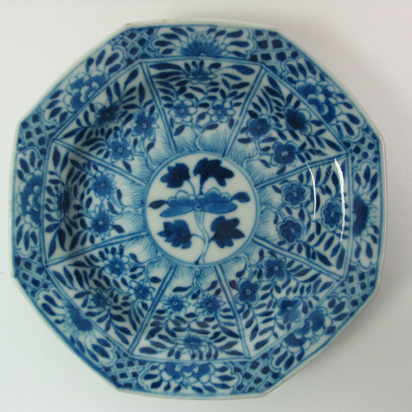 Schotel, blauw/wit porselein, voorzien van verschillende florale motieven en een achtkantige bovenrand. Onderkant beschilderd met acht florale motieven en voorzien van een merk.