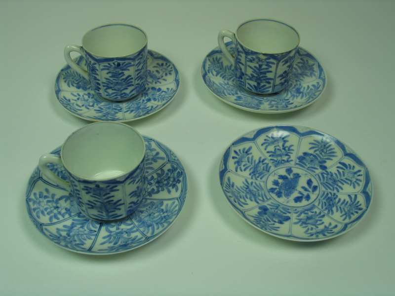 Set bestaande uit drie kopjes en vier schotels, blauw/wit porselein, voorzien van verschillende florale motieven. Onderkant schotel voorzien van drie florale motieven. Binnenkant kopje voorzien van een blauwe bies.