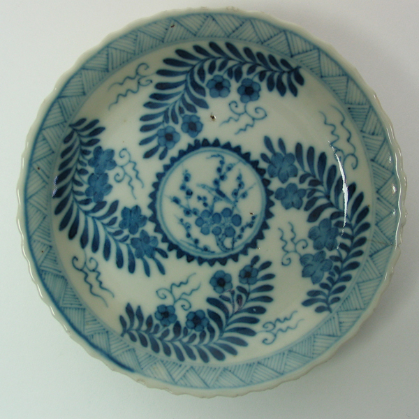 Schotel, blauw/wit porselein met geschulpte rand, Plat voorzien van verschillende florale motieven. Rand voorzien van bies met daarin arceringen. Onderkant schotel heeft drie florale motieven en een merkteken.