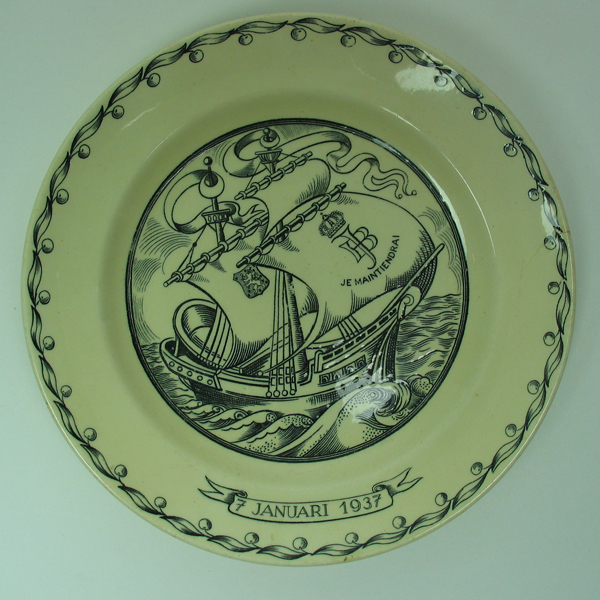 Gedenkbord, crème/zwart, ter gelegenheid van het huwelijk van prinses Juliana en prins Bernhard op 7 januari 1937. Op het plat een voorstelling van een zeilschip met in de zeilen een gekroond monogram 'JB' met daaronder opschrift: 'JE MAINTIENDRAI' en het rijkswapen. Rand voorzien van florale motief zijnde appeltjes van Oranje. Op voorkant onderaan een banderol ...