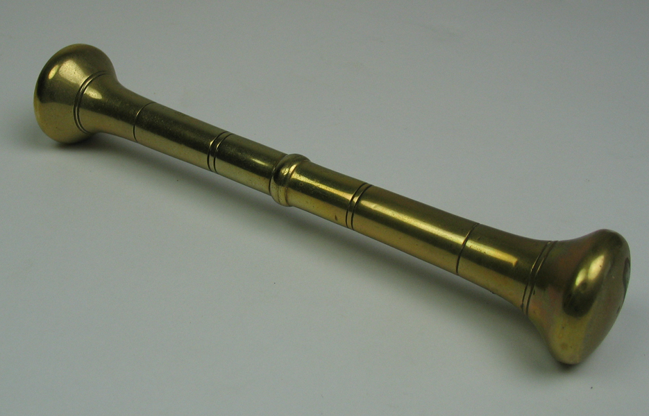 Vijzelstamper, geelkoper, voorzien van gegraveerde profielranden.