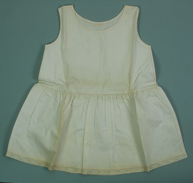 Proefstuk voor jurk, wit. Eenvoudige jurk, hals en armen afgewerkt met een biesrand. Onderkant is afgewerkt met kant. Werkstuk gemaakt op meisjesvakschool Brielle.