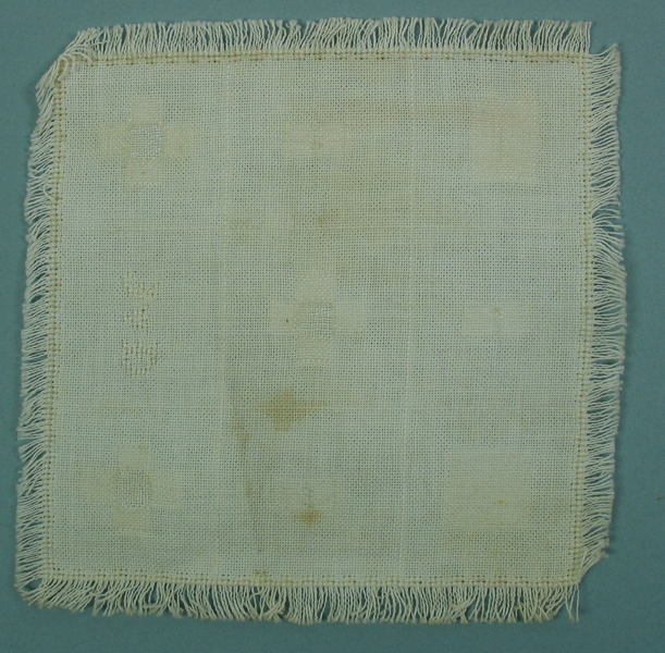Proefstuk voor gat stoppen met witte garen. Proefstuk is een vierkant lap met daarin verschillende motieven waaronder; twee vierkanten, drie rechthoeken, drie kruizen en een monogram. Randen zijn afgewerkt met rode kruissteek en franje (handwerk). Werkstuk gemaakt op meisjesvakschool Brielle.