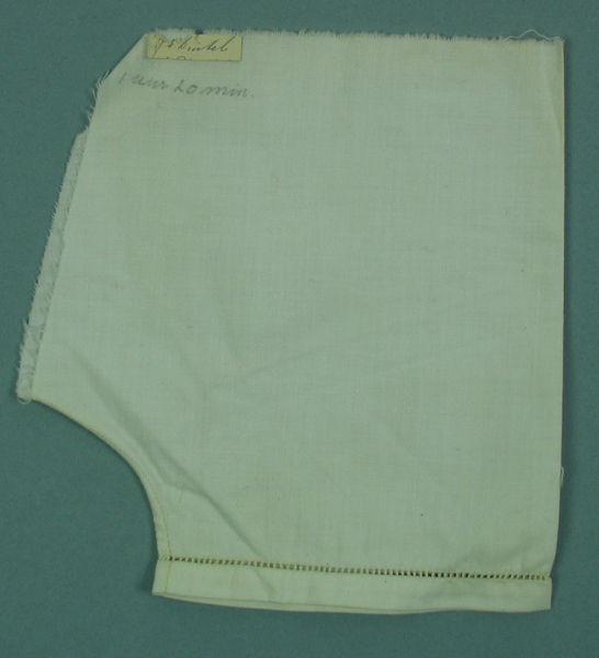 Proefstuk voor pijpafwerking. Zoom van broek met opennaald techniek. Met ronde binnenbeennaad. Werkstuk gemaakt op meisjesvakschool Brielle.