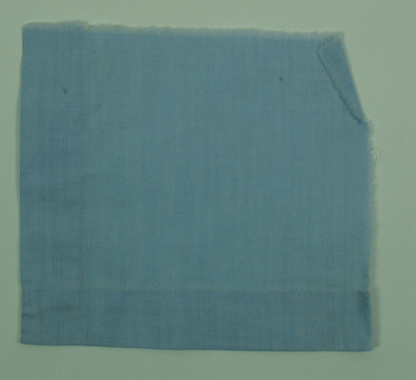 Proefstuk, vierkant, van blauw kantoen met rechte zoomafwerking. Werkstuk gemaakt op meisjesvakschool Brielle.