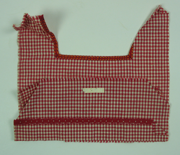 Proefstuk, rechthoek met hals, van rood geruit katoen met daarop hals en zoomafwerking d.m.v. band opnaaien en borduursteken. Etiket midden. Zijkanten van proefstuk zijn onafgewerkt. Werkstuk gemaakt op meisjesvakschool Brielle.