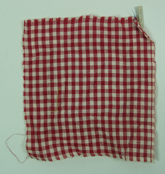 Proefstuk, vierkant, van rood geruit katoen. Op proefstuk is een stukje ingezet met vier hoeken met een doorlopend ruitje. Etiket linksboven. Zijkanten van proefstuk zijn onafgewerkt. Werkstuk gemaakt op meisjesvakschool Brielle.
