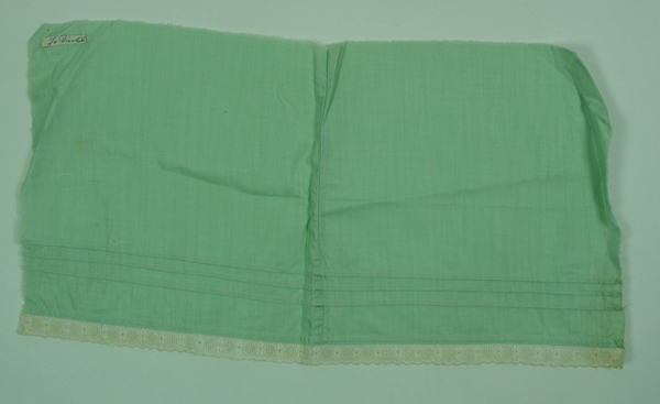 Proefstuk, rechthoekig , van groen katoen. Proefstuk met daarop diverse naaitechnieken waaronder; Engelse naad, zoom afwerking, oprijgjes (naaldplooitjes), kant aanzetten, platstikken afwerkrand kant. Etiket linksboven. Zijkanten van proefstuk zijn onafgewerkt. Werkstuk gemaakt op meisjesvakschool Brielle.