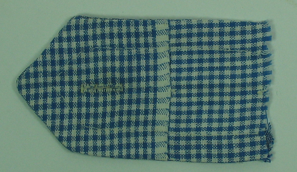 Proefstuk, rechthoekig met punt , van blauw geruit katoen. Proefstuk voor een schouderonderdeel met punt dubbelen, daarin een knoopsgat en afwerken met schuine bies. Etiket in het midden. Een zijkant van proefstuk is onafgewerkt. Werkstuk gemaakt op meisjesvakschool Brielle.