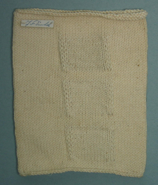 Proefstuk breiwerk tricotsteek en stuk inbreien. Proefstuk is rechthoekig, crème, met daarin in crème ingebreide rechthoekige stukken. Etiket linksboven. Werkstuk gemaakt op meisjesvakschool Brielle.