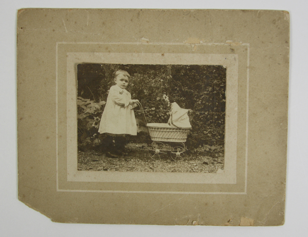 Foto, zwart/wit, van een meisje of peuter met poppenwagen. Het meisje draagt een jurkje en zwarte open schoentjes. Foto is in een tuin of plantsoen gemaakt. Foto geplakt op een grijs/beige karton voorzien van twee witte kaders.