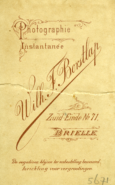 Foto, sepia, van een jonge vrouw. Vrouw draag jurk of blouse, aan de voorkant voorzien van twee rijen zwarte knoopjes. Jurk of blouse voorzien van donkere halsboord met daarop een broche. Foto is geplakt op een grijs/beige karton. Opschrift aan onderzijde en op achterkant.