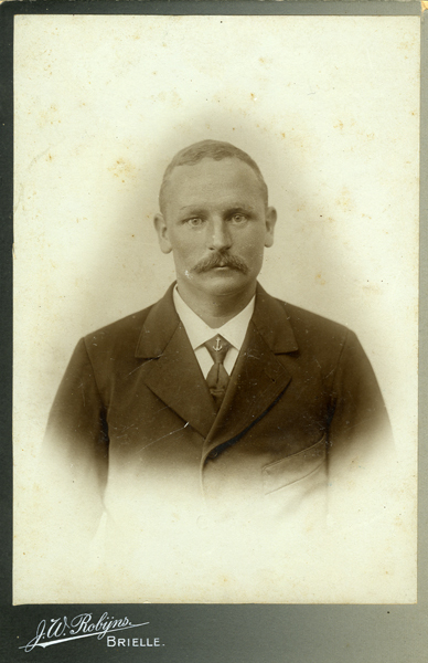 Foto, sepia, met portret van een man met snor. Verder draagt de man een donker gekleurd kostuum met witte blouse en donkere stropdas. Op de stropdas zit een speld in de vorm van een scheepsanker. Foto is geplakt op een grijs karton. Opschrift aan onderzijde.