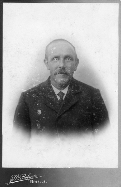 Foto, sepia, met portret van een oudere man met snor. Verder draagt de man een donker gekleurd kostuum met witte blouse en donkere stropdas. Foto is geplakt op een grijs karton. Opschrift aan onderzijde.