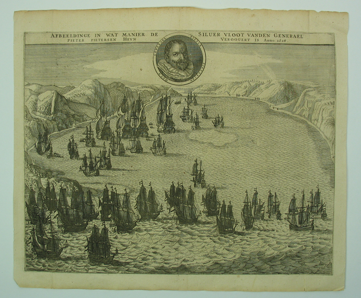 Prent, ets, met verovering van de Zilvervloot in de Baai van Matanzas door door een vloot van de WIC onder bevel van admiraal Piet Heyn op 8 september 1628. Bovenaan een rond portret van admiraal Piet Heyn met daaromheen een rondschrift. Op voorgrond prent diverse schepen in een baai. Rondom de baai diverse heuvels van ...