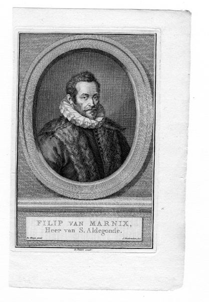 Prent, kopergravure met portret van Filip van Marnix (Brussel 1540 - Leiden 1598). Borstbeeld, lichaam en hoofd naar links gedraaid. Kijkt beschouwer an face aan. Man heeft kort, golvend haar en draagt een baard met sik en snor. Man draag een mantel afgezet met bont en een hoge, witte, geplooide kraag. Onder medaillon opschrift. Gesigneerd ...