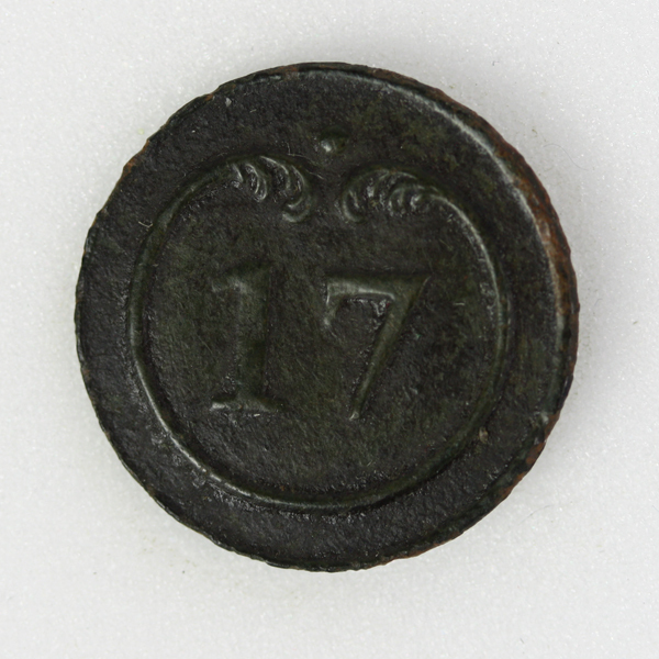 Knoop zijnde een uniformknoop of regimentsknoop uit leger van Napoleon Bonaparte. In het midden het nummer '17' van het regiment omringd door een floraal motief.