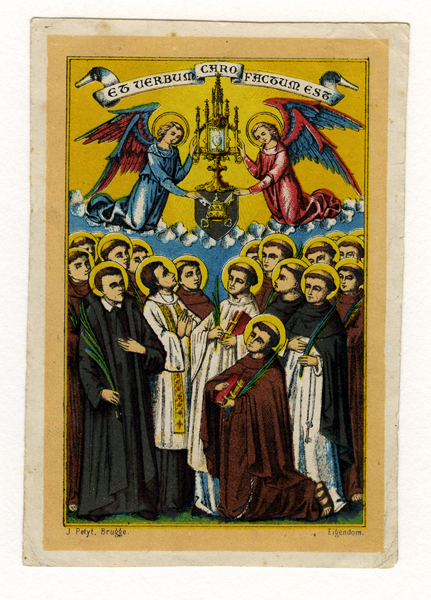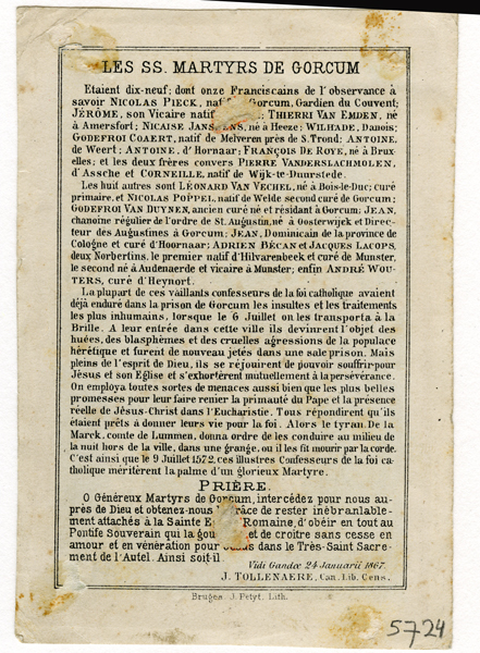 Franse bidprent van de Martelaren van Gorcum. Op de voorzijde van de bidprent worden de negentien Martelaren van Gorinchem afgebeeld op een geel fond. Boven de martelaren houden twee engelen een monstrans vast en een wapenschild met daarin de 'sleutels van Petrus'. Geheel boven een banderol met Latijnse tekst. Linksonder gesigneerd. Op de achterkant staat ...