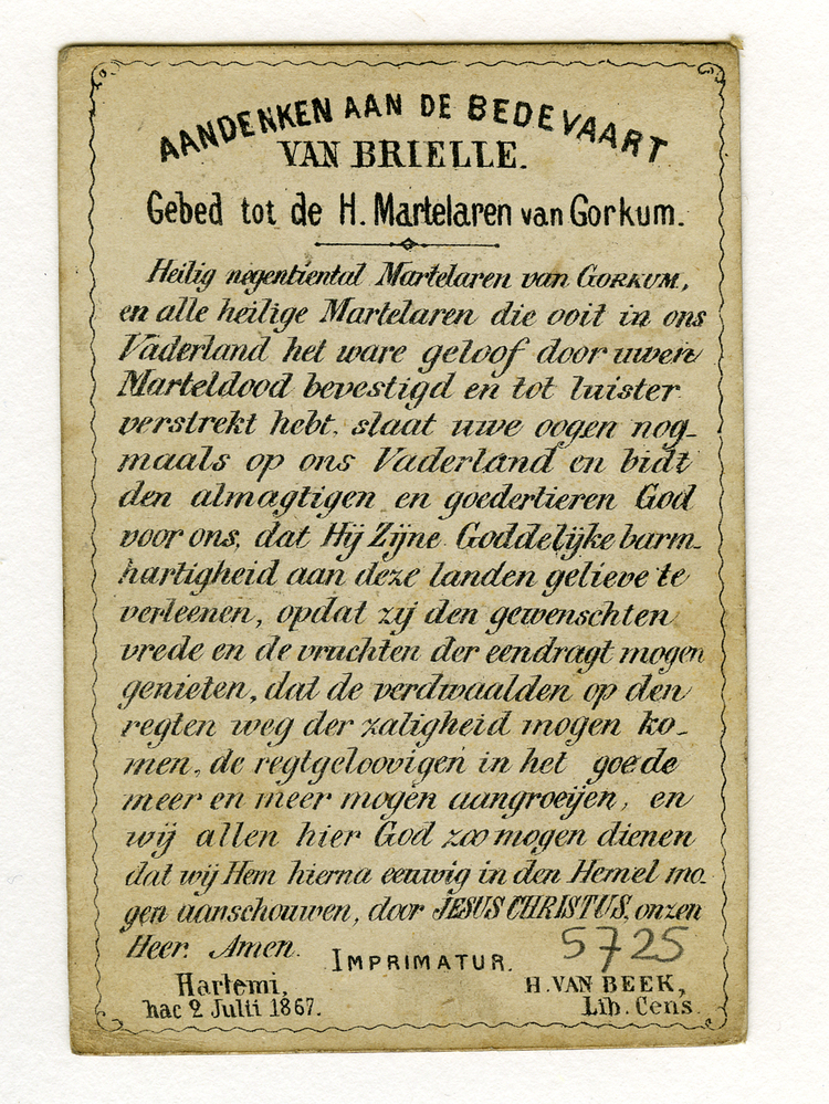 Bidprent van de Martelaren van Gorcum, beige/zwart. Op de voorzijde van de bidprent worden de negentien Martelaren van Gorinchem als bloemen afgebeeld. Onder de afbeelding de tekst: Bloemen van de H.H. Martelaren van Gorcum. Rondom de afbeelding van de martelaren de namen van de negentien martelaren. Op de achterzijde staat een gebed.