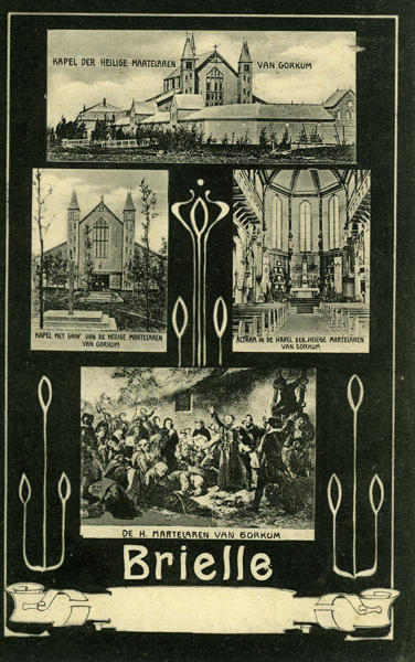 Ansichtkaart, zwart/wit met afbeelding van binnen- en buitenkant van bedevaartskerk van H.H. Martelaren van Gorkum. Achterzijde met potlood beschreven. Met stempel (10/11 juli 1906) en postzegel van 1 cent.