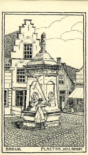 Reproductie van een pentekening, zwart/wit met oude afbeelding van het Wellerondom te Brielle in kader. Op de voorgrond de pomp waarbij een persoon in achttiende eeuws kleding water aan het pompen is. Opschrift onder afbeelding.