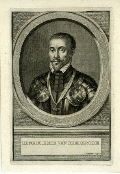 Prent, kopergravure met portret van Hendrik van Brederode, heer van Brederode, Vianen en burggraaf van Utrecht (1531-1568). Lichaam en hoofd naar rechts gedraaid. Kijkt beschouwer en face aan. Man heeft kort haar, draagt een korte baard met snor. De man is gekleed in een harnas en draagt om zijn nek een onderscheiding aan een brede ...
