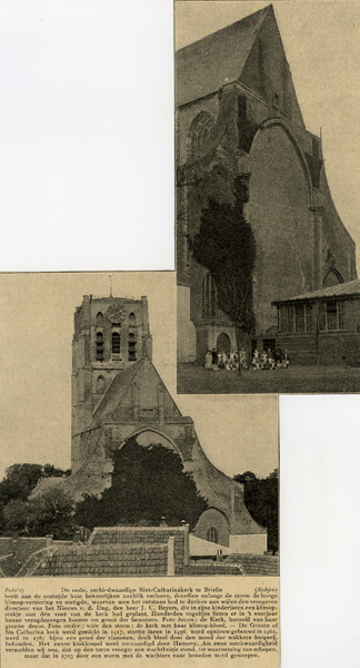 Artikel 'storm brengt schade aan klimop-versiering St. Catharijnekerk' afkomstig uit De Prins van 25 april 1908. Klein artikeltje onder twee zwart/wit foto's. Eén foto van de kerk voor de storm en één na de storm.