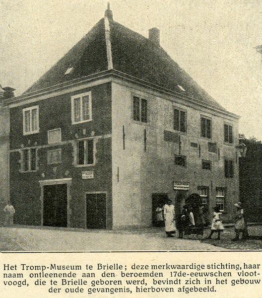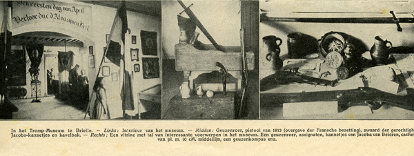Artikel, bestaande uit twee uitgeknipte stukjes, over voormalig Trompmuseum afkomstig uit tijdschrift De Prins van 21 september 1912. Eén met zwart/wit foto van buitenkant museum met daaronder een korte beschrijving en één met drie zwart/wit foto's van interieur museum met daaronder eveneens een korte beschrijving.
