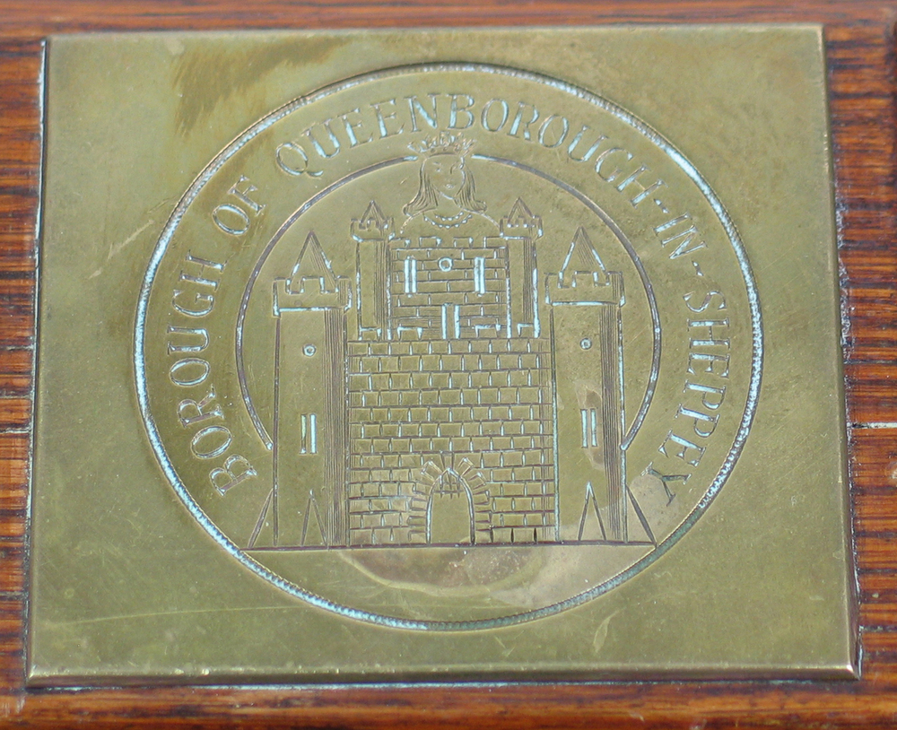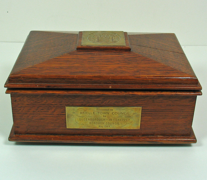 Kistje 'Queenborough-In-Sheppey', hout, afkomstig van zusterstad van Brielle Queenborough-In-Sheppey'. Kistje met scharnierend deksel, welke open blijft staan door een koperen ketting. Binnenkant is bekleed met blauw vilt. Bovenkant kist en voorkant kist voorzien van een koperen plaat voorzien van inscipties. Kist aan onderkant voorzien van groen vilt en vier pootjes.