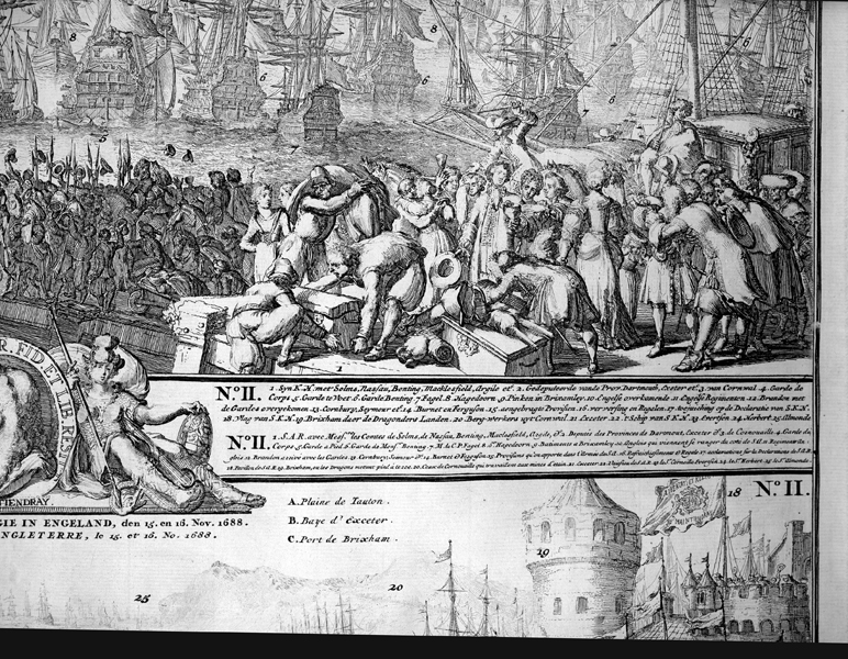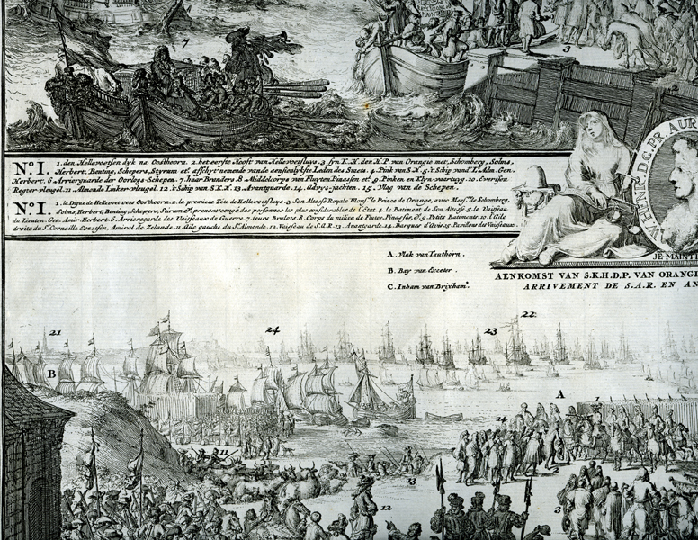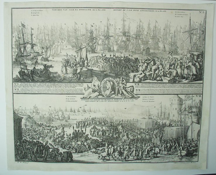 Vertrek van S.K.H. na Engeland, den 11. Nov. 1688 Depart De S.A.R. pour Angleterre, Le 11. No. 1688. Aenkomst van S.K.H. D.P. van Orangie in Engeland, den 15 en 16. Nov. 1688, Arrivement de S.A.R. en Angleterre, le 15. et 16. No. 1688.