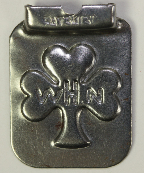Metalen plaatje met twee weerhaakjes aan de achterzijde en op de voorzijde een klaverblad met daarin de letters WHN.