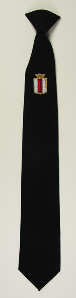 Stropdas, zwart/blauw, bovenaan voorzien van het wapen van Brielle. Deze das valt onder de zogeheten veiligheidsstropdassen en wordt ook wel clipstropdas genoemd. Aan de achterkant van deze stropsdas zit bovenaan een zilvelkleurig haakje. Dit haakje wordt aan het overhemd bevestigd en schiet los als er aan getrokken wordt. Deze stropdas is als proefmodel gemaakt door ...
