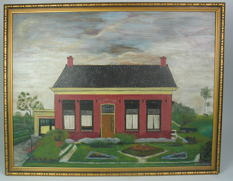 Schilderij, olieverf op paneel, met gezicht op huis te Zwartewaal gelegen aan de Henry Fordstraat 23. Op de voorgrond het huis. In het midden de voordeur met aan weerzijden twee gelijke ramen met daarvoor gordijnen/vitrage. Op de voorgrond zicht op een aangelegde tuin. Gesigneerd rechtsonder. Schilderij in smal, goudkleurige lijst.